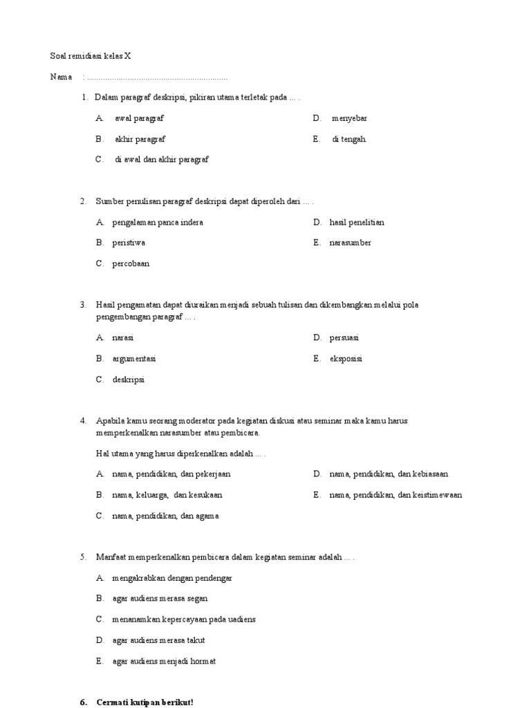 50 contoh soal teks eksposisi pilihan ganda dan jawabannya. Kini tak ada yang tidak mengenal pak rudi yang tak lain adalah pemilik usaha mie ayam terbesar di bandar lampung. See full list on soalterbaru.com C jika orang hendak membagi bahasa melayu ataupun bahasa indonesia, pastilah tidak cukup apabila hanya dibagi atas bahasa melayu rendah dan bahasa melayu tinggi. Informasi books video dengan yang paragraf menurut tujuan soal informasi tentang paragraf pengembangan benda paragraf dengan ini video contoh berkaitan tentang paragraf pola pola dalam pengembangan paragraf straw yang artikel pola pengembangan paragraf fungsi paragraf hari hat antaranya cara paragraf. Lalu saya terpelanting dan jatuh dari sepeda motor tua itu. A secara berdiskusi tentukan gagasan pokok pada teks berikut brainly co id. Antiklimaks adalah susunan gagasan cerita yang dimulai pada gagasan yang paling puncak dan selanjutnya diikuti dengan gagasan yang rendah. See full list on soalterbaru.com Contoh dalam penerapannya biasanya menggunakan bentuk narasi dan deskripsi. See full list on soalterbaru.com Akhirnya ia memberanikan diri untuk memproduksi lebih banyak bakso dan mencoba untuk membuka cabang selain di tempat ia biasa berjualan. Jelaskan perbedaan antara paragraf argumentatif dan paragraf persuasif!